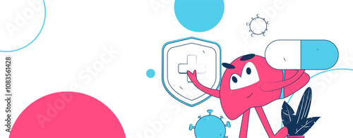 Cartoon cute tablet capsule in superhero costume defeat bacteria, microbe or virus vector illustration. Corona virus, flu or dangerous infection outbreak overcoming concept