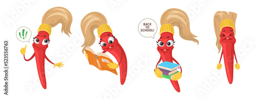 School brush character vector set isolated on white background. Cute cartoon mascots with different expression and facial emotion. Back to school elements illustration