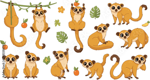 Cute squirrel cartoon character set, flat vector isolated illustration. Funny animals sleeping, eating acorns, running, playing. Forest wild animals different activities. Emoji, logo, sticker.