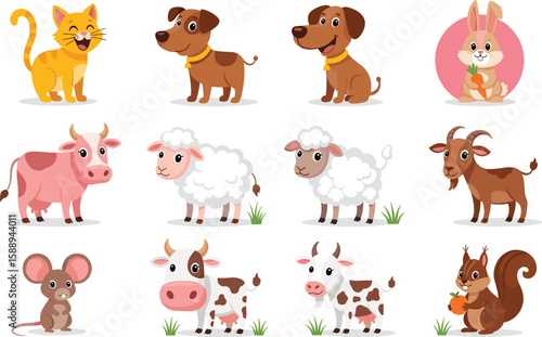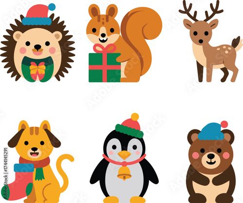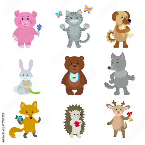 Cute animals with food and drink icon set. Vector illustration of funny hedgehog fox bear squirrel owl raccoon rabbit deer and panda eating their favourite food isolated on white background.
