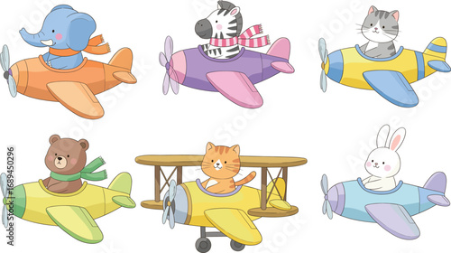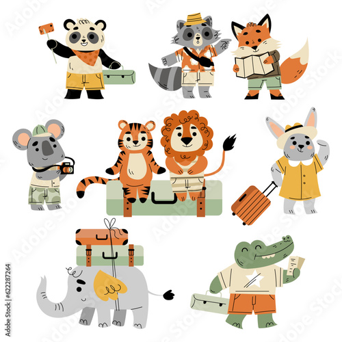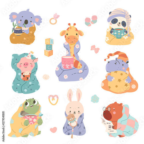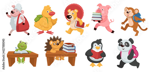 Cute wild animals with books icon set. Vector illustration of funny hedgehog fox bear squirrel owl raccoon rabbit deer and panda reading books isolated on white background.