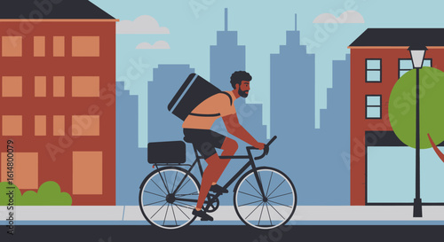 Vector illustration of two cyclists riding on bikes in the city. Sports equipment, helmet, gloves, glasses, sneakers and bicycles. City landscape. Flat design