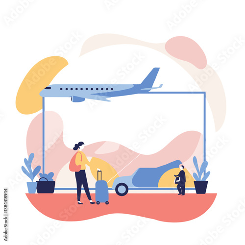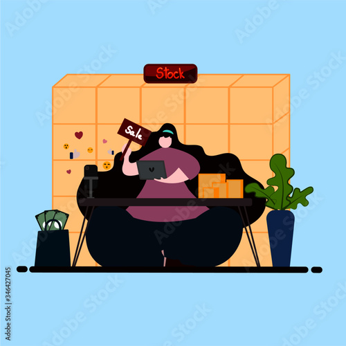 Daily life. Young woman waking up, sitting on bed with cup of coffee, water bottle and laptop computer in the morning, flat vector illustration. Daily morning routine, everyday activities, habits.