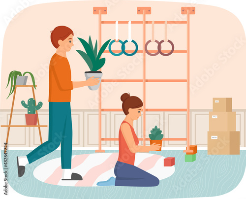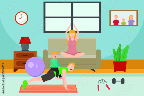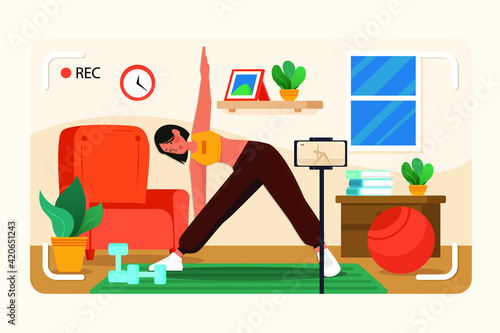 Daily life. Young woman doing yoga exercises, flat vector illustration. Daily routine, everyday activities. Sport, fitness online. Home yoga. Active and healthy lifestyle.