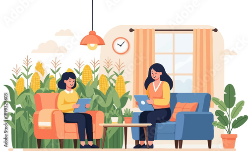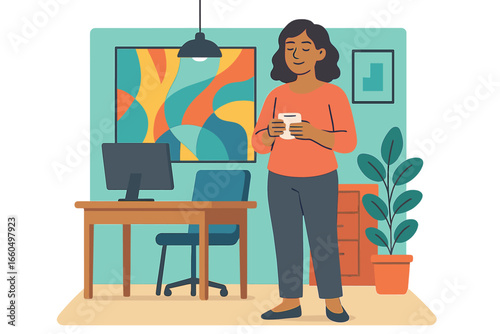 Daily life. Young woman having breakfast at home, flat vector illustration. Happy girl sitting at table, eating, drinking coffee and using smartphone. Daily morning routine, everyday activities.