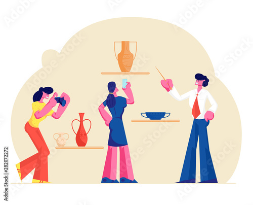 Huge organic cow milk bottle and glass, bowl of cottage cheese, micro male characters, vector illustration. Healthy milk and dairy products composition for web banner, website page etc.