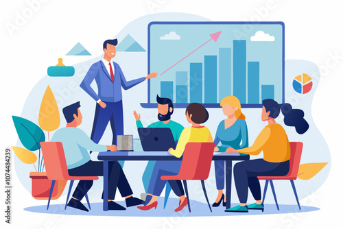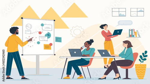 Data analysts, micro male and female characters analysing statistical data of analytics charts on tablet screen, vector flat style design illustration. Business analytics, financial data analysis.