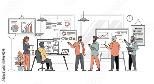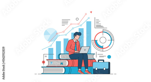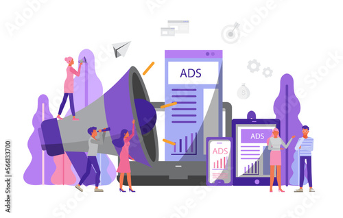 Data analysts, micro male and female characters analysing statistical data of analytics charts on tablet screen, vector flat style design illustration. Business analytics, financial data analysis.