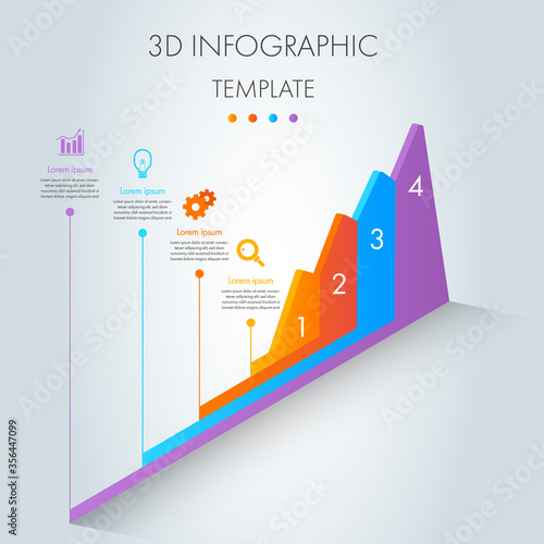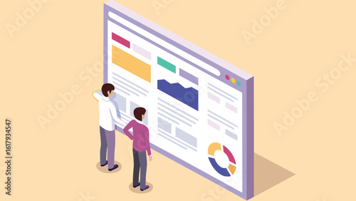 Data analytics concept. Vector isometric illustration of man looking at business statistics charts and graphs.