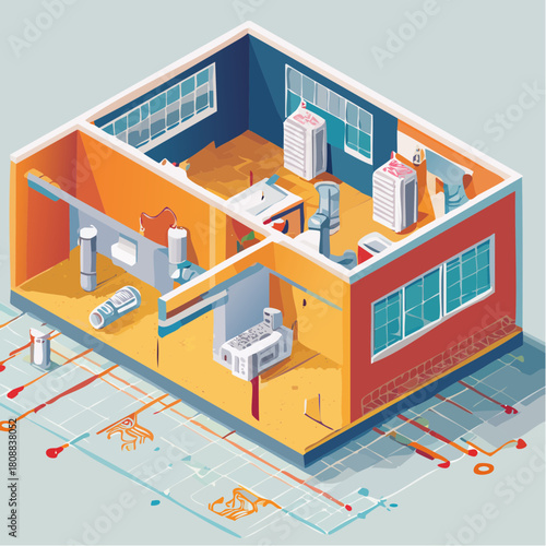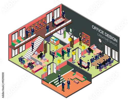 Data center cutaway interior vector flat isometric illustration with server rooms, server racks and personnel working there.