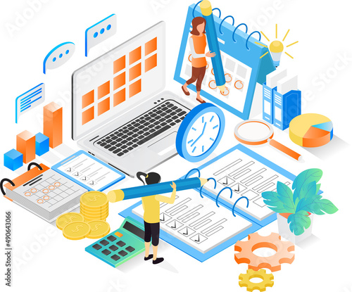 Data center flowchart, vector illustration. Isometric laptop computer, mobile phone, server room racks, wifi router. Cloud storage, data transfer.