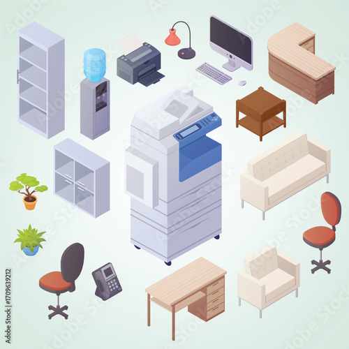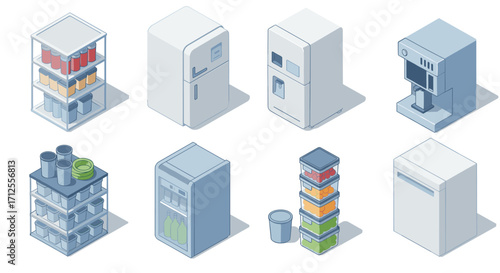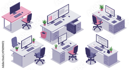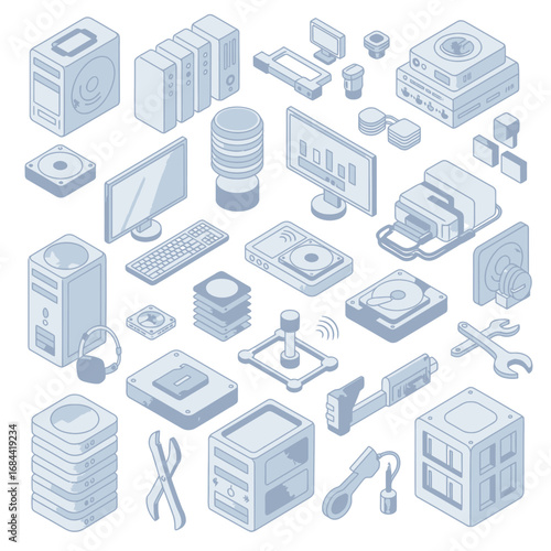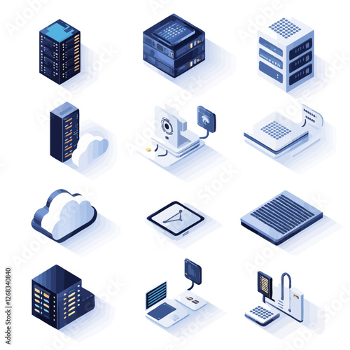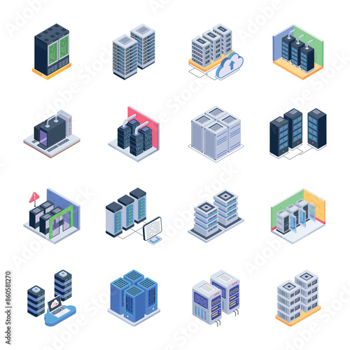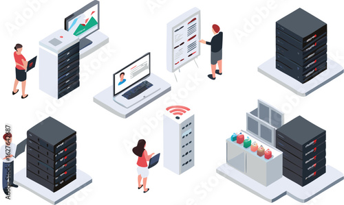 Data center isometric icon set, flat vector isolated illustration. Computer network equipment and staff. Server racks, operator, technician, engineer characters.