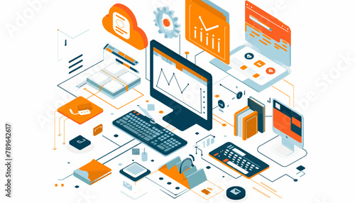 Vector flat isometric flowchart of data center with cloud service, security, energy control, wireless technology, file hosting, money saving infographic symbols.