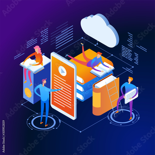 Data security flowchart, vector illustration. Isometric data center server racks, cloud, shield, computer bugs, gears, magnifying glass. Cloud technologies and data protection.