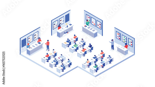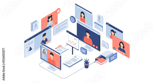 Customer support, computer service, flat isometric vector illustration. Data synchronization process between laptop computer and mobile phone devices. Technical assistance.