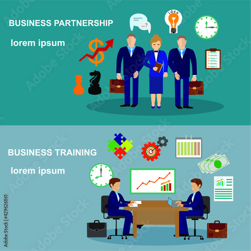 Vector illustration of businessman and businesswoman making a great deal and shaking hands. Deal concept design element in flat style.