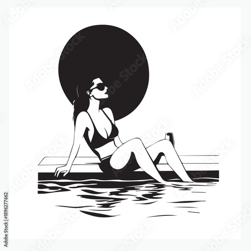 Vector illustration of woman in red swimming suit and sun hat sitting on deckchair. Summer people concept flat style design element, icon isolated on white background.