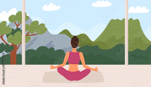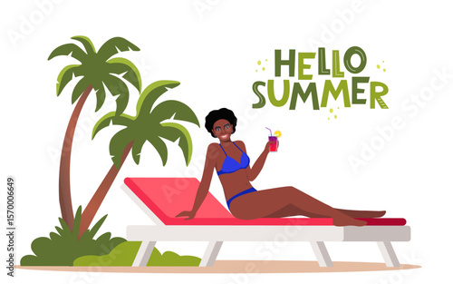 Vector illustration of redheaded woman in red swimming suit sitting on lounge chair. Girl using protective cream. Deckchair flat style design element.