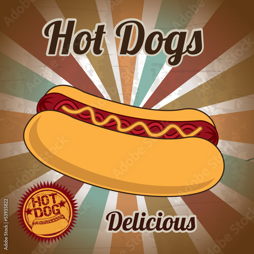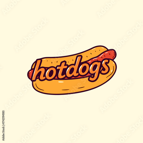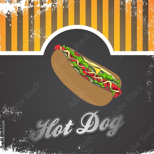Delicious hot dog with ribbon and text, vector isolated illustration. Realistic hot dog bun with sausage, lettuce salad, tomato, cucumber, onion, ketchup and mustard. Fast food promo banners.