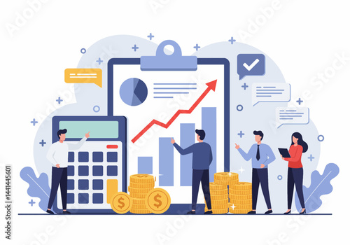 Vector illustration of warehouse, female sitting on delivery truck with bar diagram, parcels, statistics bar graphs and charts, paper plane. Worldwide delivery concept for web banner, website page etc