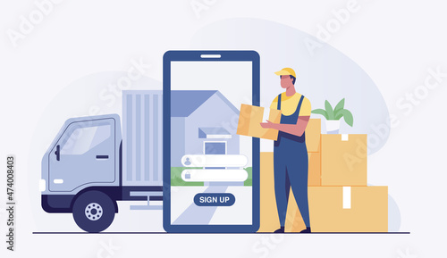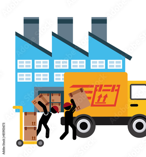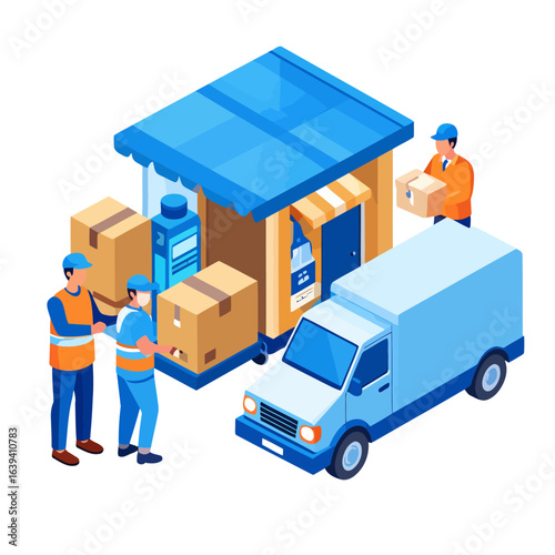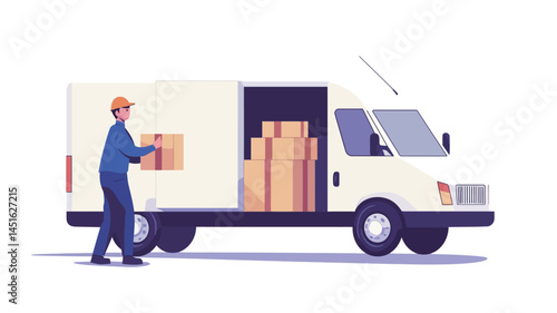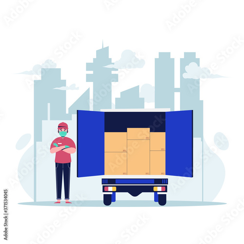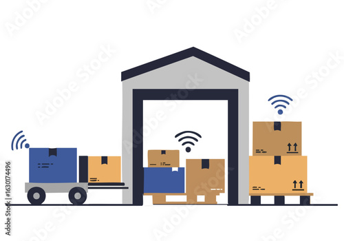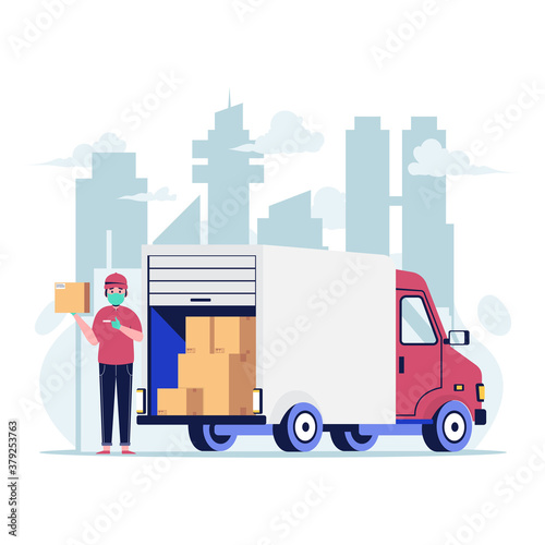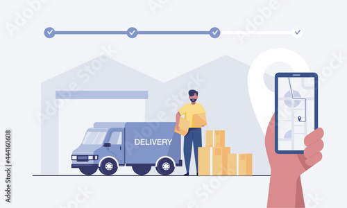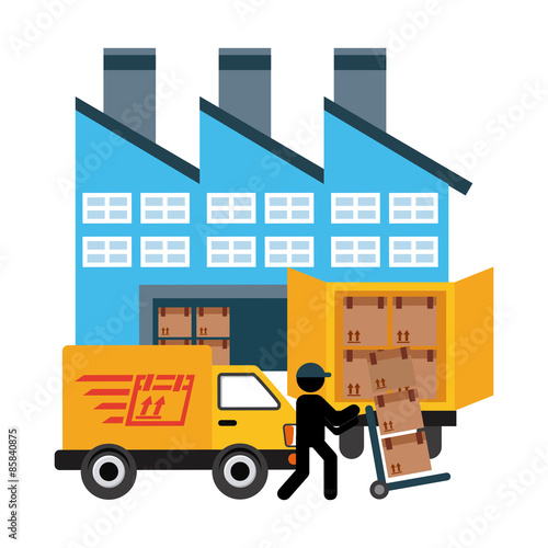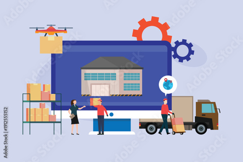 Vector illustration of warehouse, delivery truck, parcels, worker, statistics bar graphs and charts. Delivery logistics shipping transportation concepts for web banner, website page, presentation etc.
