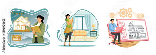 Delivery landing page design, website banner template set, flat vector illustration. Woman packing parcel. Online delivery service.