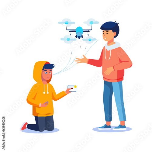 Vector illustration of postman delivering letters to receiver man. Delivery people concept flat style design element, icon isolated on white background.