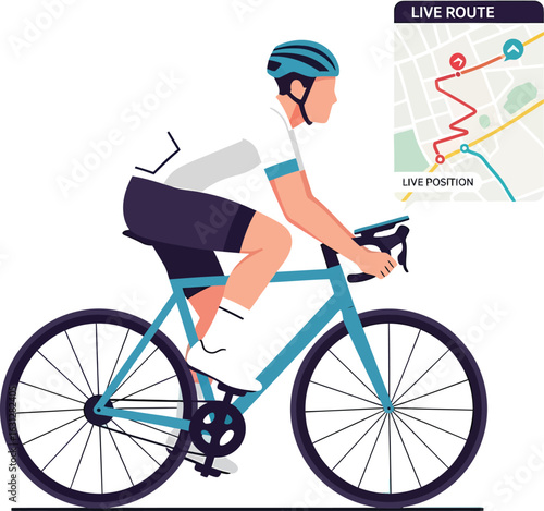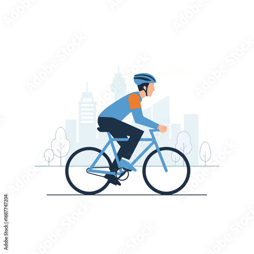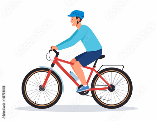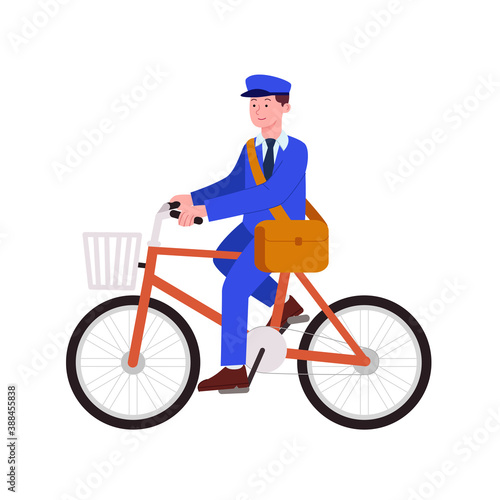 Vector illustration of postman riding bicycle and delivering mail. Cheerful smiling mailman with post bag. Delivery people concept flat style design element, icon isolated on white background.