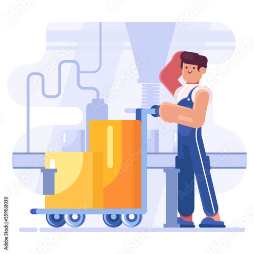 Vector illustration of loader lifting cardboard boxes using lift truck. Delivery people concept flat style design element, icon isolated on white background.