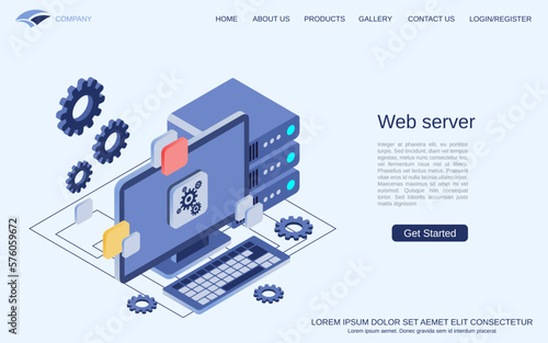Delivery service, landing page design, website banner template, flat vector isometric illustration. Courier delivering parcel from shop to customer home door.