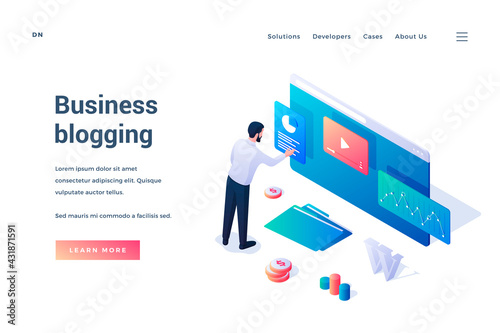 Delivery company landing page template. Vector illustration of warehouse, delivery truck, parcels, statistics bar graphs, worker. Delivery and logistics concept for website and mobile site development