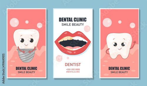 Dental braces vector poster banner template. Cute happy teeth with metal braces. Orthodontic treatment, bite correction or jaw alignment concept.