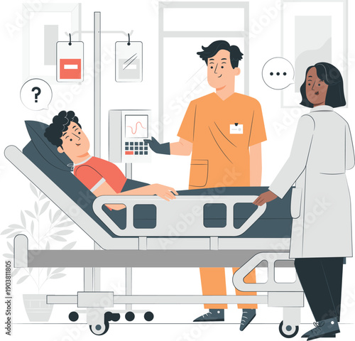 Dentist and assistant treating patient teeth vector illustration. Man with toothache at doctor stomatologist appointment. Dentistry concept