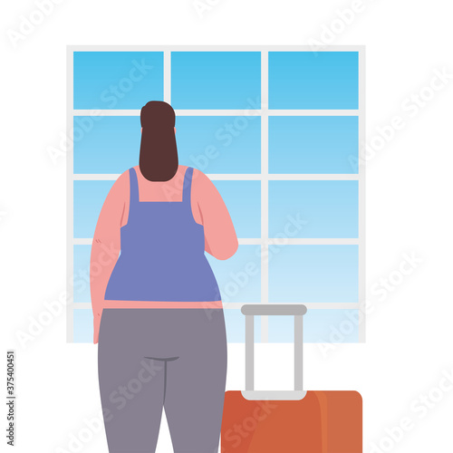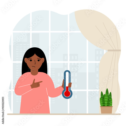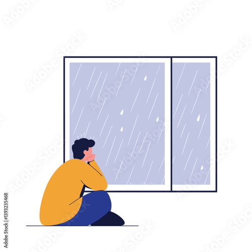 Depressed young girl sitting on window sill with her lovely pet cat. Vector flat style design illustration.