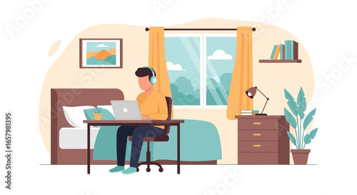Depressed young man sitting at office table full of documents. Vector flat style design illustration. Overloaded, exhausted office worker because of doing paperwork.
