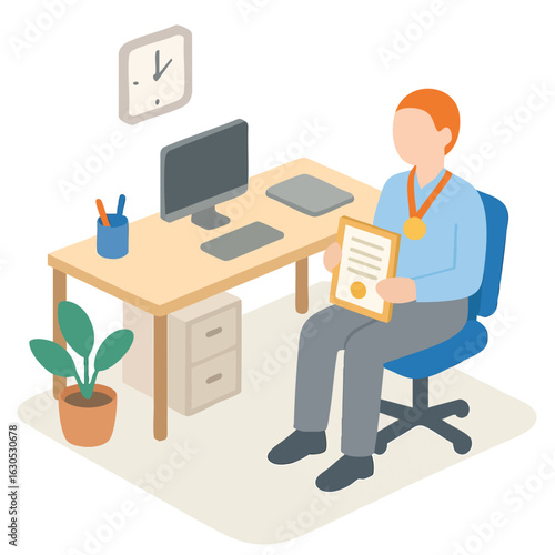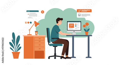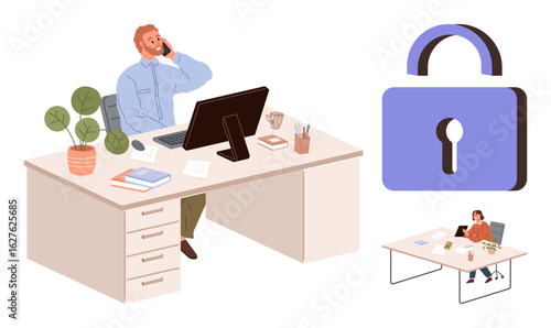 Depressed young man standing at office table full of folders and documents. Vector flat style design illustration. Overloaded, exhausted and stressed office worker because of doing paperwork.