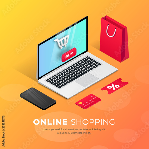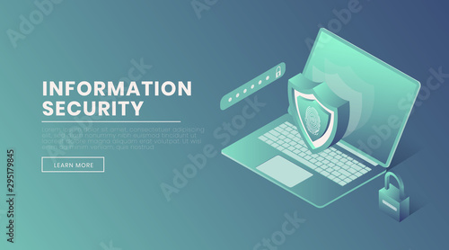 Desktop cryptocurrency wallet, flat vector illustration. Isometric laptop computer with bitcoins and shield. Digital money storage, online crypto coin wallet.