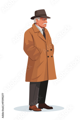 Detective in coat and hat with smoking pipe looking through magnifying glass portrait isolated on white background. Inspector engaged in investigation crime concept