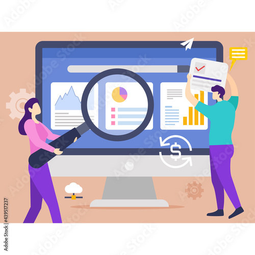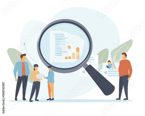 Vector illustration of big magnifying glass and tiny private investigators holding magnifier, taking photo, looking through telescope, walking with dog. Detective services concept for web banner etc.