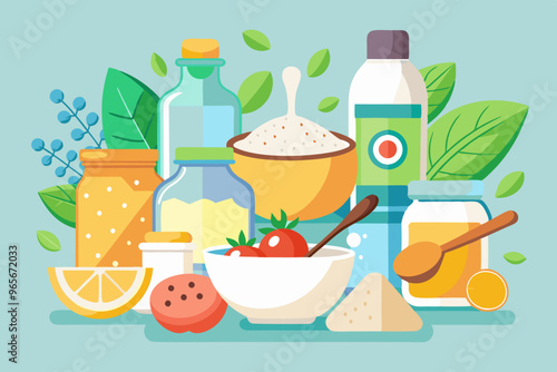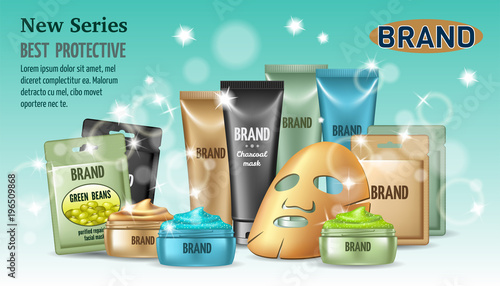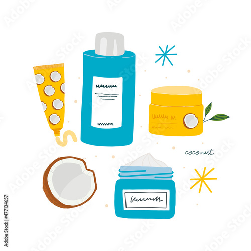 Body skin cosmetics vector. Eye gel, balm, sunscreen cream in bottles, tubes and jars illustration. Organic beauty product for skincare and hygiene. Promotion and advertising concept