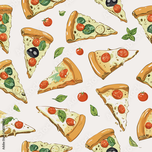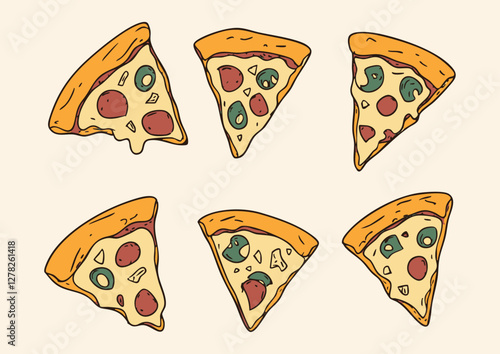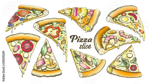 Different italian pizza slices vector illustration. Fastfood restaurant, pizzeria or cafe menu design template. Vegetarian and traditional snack for lunch or dinner
