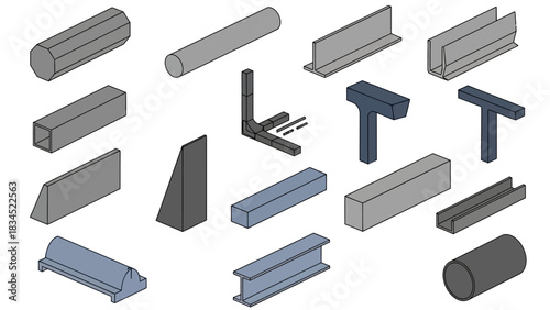 Different metal profiles construction materials realistic set isolated on white background. Stainless steel beam tube, armature, pipe, joist and girder vector illustration