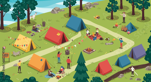 Different people walking, riding eco-friendly transport, training in park vector illustration. Active adults and kids enjoying leisure activities on weekend vacation at urban recreation area