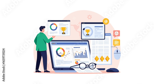 Different services ranking vector. Client feedback and opinion rating illustration. Human hand holding smartphone with survey report about workman or building company reputation