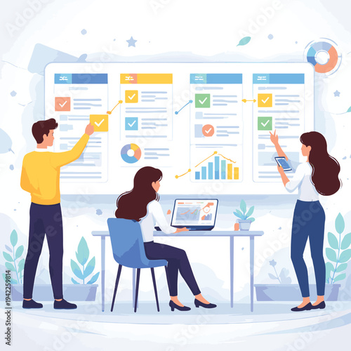 Digital advertising, vector flat illustration. Businessman analysing e-marketing stats on computer screen dashboard. Product promotion, advertising campaign, digital marketing strategy concept.