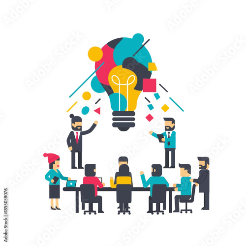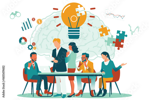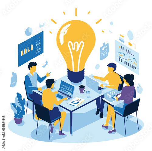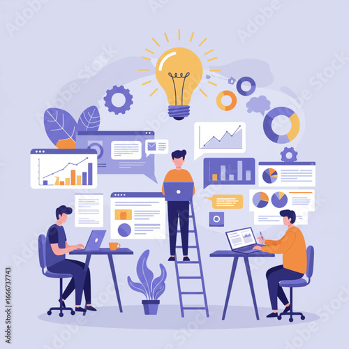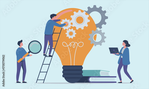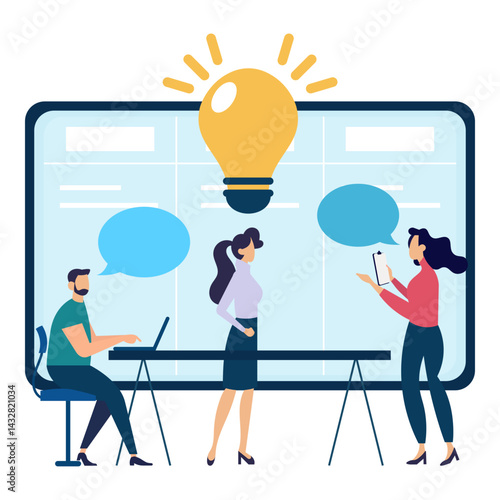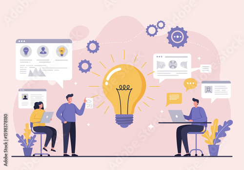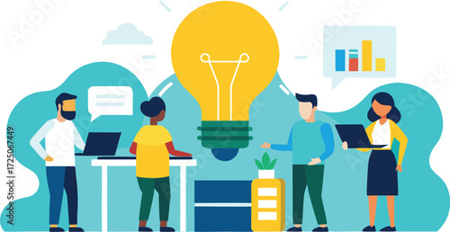 Marketing, vector flat illustration. Big light bulb creative idea and tiny people digital marketing professionals with megaphone, laptop. Business promotion and solution concept for web banner, etc.