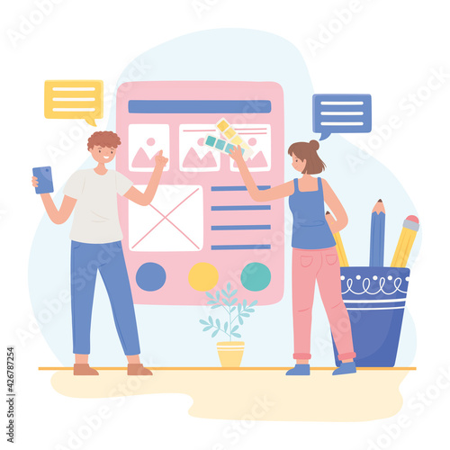 Digital nft art auction flat vector illustration. Non-fungible token market, non-interchangeable unit selling and buying. Man and woman make deal. Blockchain, bitcoin cryptocurrency and digital craft