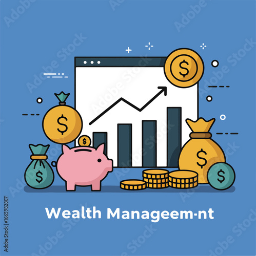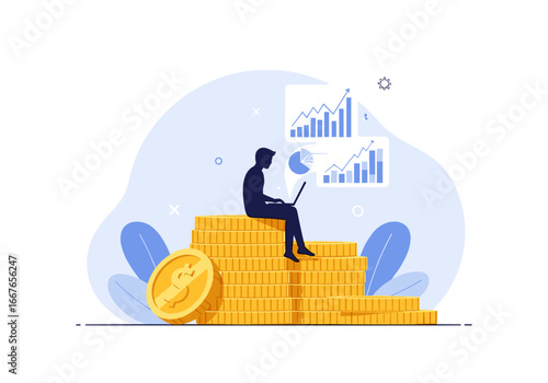 Diploma, graduation hat, piggy bank with money, woman working on laptop sitting on dollar coin stack, flat vector illustration. Student loan, saving money for education, scholarship.