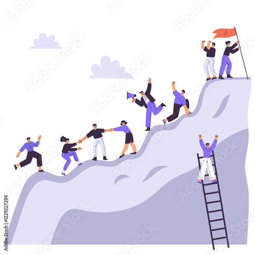 Disabled people conquering mountain peak, vector flat illustration. Path to success concept. Happy male and female characters with disabilities overcoming difficulties and achieving success in life.