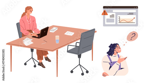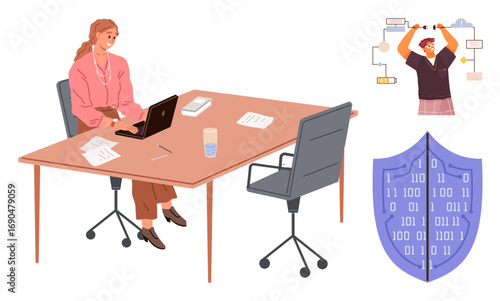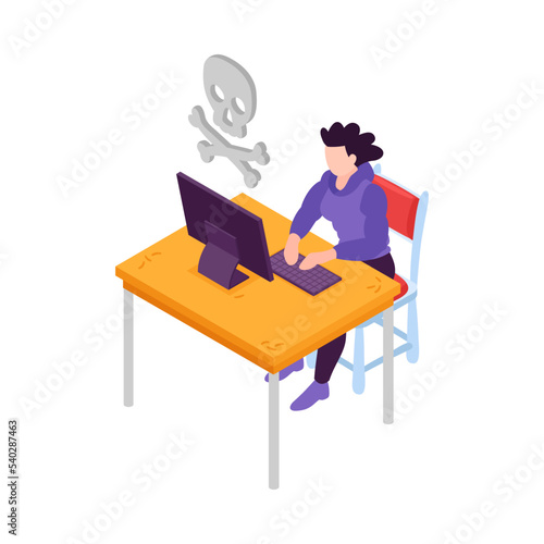 Disabled woman with hand prosthetics vector. Isometric female character with bionic arm working on laptop sitting in wheelchair. Handicapped people lifestyle isolated on white background